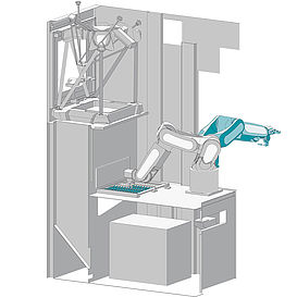 В производственном процессе роботизированный модуль фиксируется перед рабочей зоной станка. Затем робот входит в рабочую зону через автоматизированную дверь станка, которая автоматически открывается за роботизированным модулем.